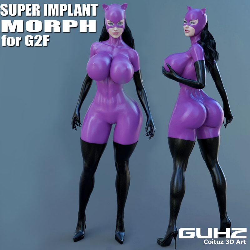 Super Implant Morph For G2F is a single Slider Morph and Character preset for Genesis 2 Female. This product was create and sculpted in zbrush to make a Super heroine with big round ass and fake breast Implant.